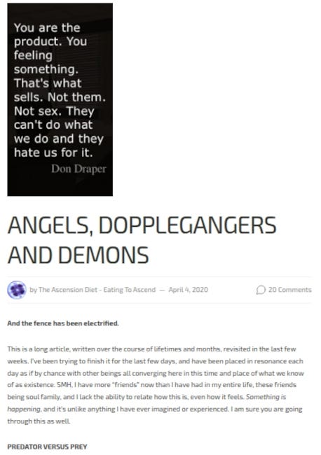 The article linked above, ANGELS, DOPPLEGANGERS AND DEMONS describes, for one with eyes to see and ears to hear, why I don’t have a publisher, don’t advertise, and don’t strive to “get people addicted”.